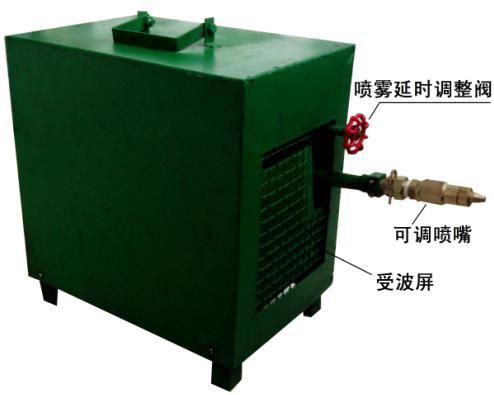 本裝置設(shè)計為一體化,有進水閥門、噴霧時間調(diào)整閥門等組成,當(dāng)迎頭放炮時震動沖擊波沖擊機械放炮噴霧裝置的受波屏,進水閥門打開,開始噴霧,同時水源又給進水延時水箱注水,由于延時水箱與所配墜鐵比重偏移,水箱的水滿后,水箱逐漸傾斜并緩慢放水,從而逐漸減少噴霧延時時間,水箱的水流盡后,噴霧停止,直至下一次放炮,再次循環(huán)實現(xiàn)噴霧過程。噴霧延時水箱有進水調(diào)整閥門,調(diào)整此閥門可調(diào)整噴霧時間。