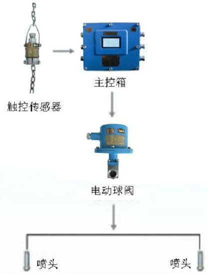 當(dāng)皮帶運(yùn)輸機(jī)輸煤時(shí),煤流觸動(dòng)傳感器探桿,觸控傳感器接收到信號(hào)觸發(fā)主控箱控制電路,打開(kāi)電動(dòng)球閥,裝置自動(dòng)灑水降塵,無(wú)物料時(shí)延時(shí)一段時(shí)間后停止噴霧(延時(shí)可調(diào))。